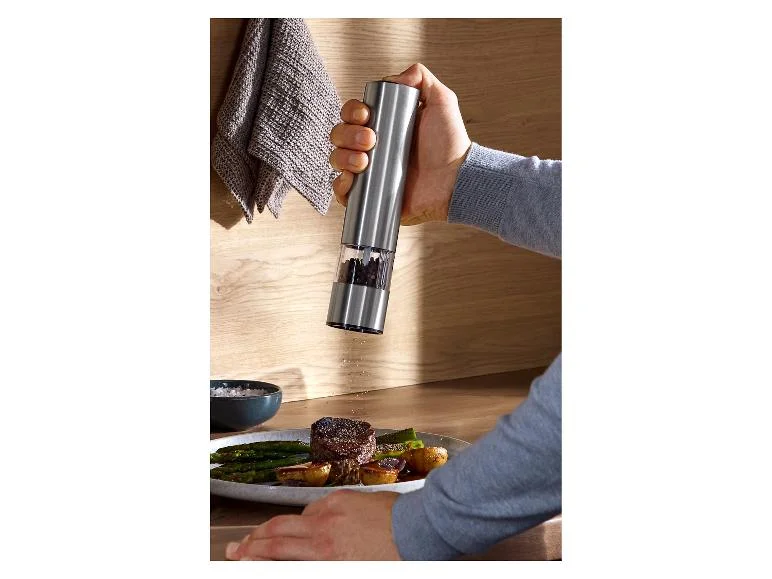 Az egykezes kezelés lehetővé teszi, hogy az egyik kézzel tartsa a serpenyőt, míg a másikkal könnyedén fűszerez. Az elegáns rozsdamentes acél borítás stílust kölcsönöz a konyhájának. A védőkupak megakadályozza az aromaveszteséget, így mindig friss és intenzív ízeket élvezhet. Az elemekkel együtt szállítva azonnal használatba veheti ezt a praktikus konyhai eszközt.